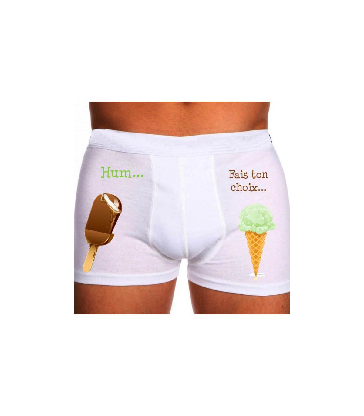 Offrez un cadeau qui ne passera pas inaperçu et qui laissera de très bons souvenirs ! Ce sous-vêtement boxer pour homme est vraiment très rigolo, affichant un choix de glace gourmand et 100% humoristique. C'est l'idée parfaite pour surprendre votre homme, un ami, ou pour un enterrement de vie de garçon. Le rire est garanti dès l'ouverture du paquet !