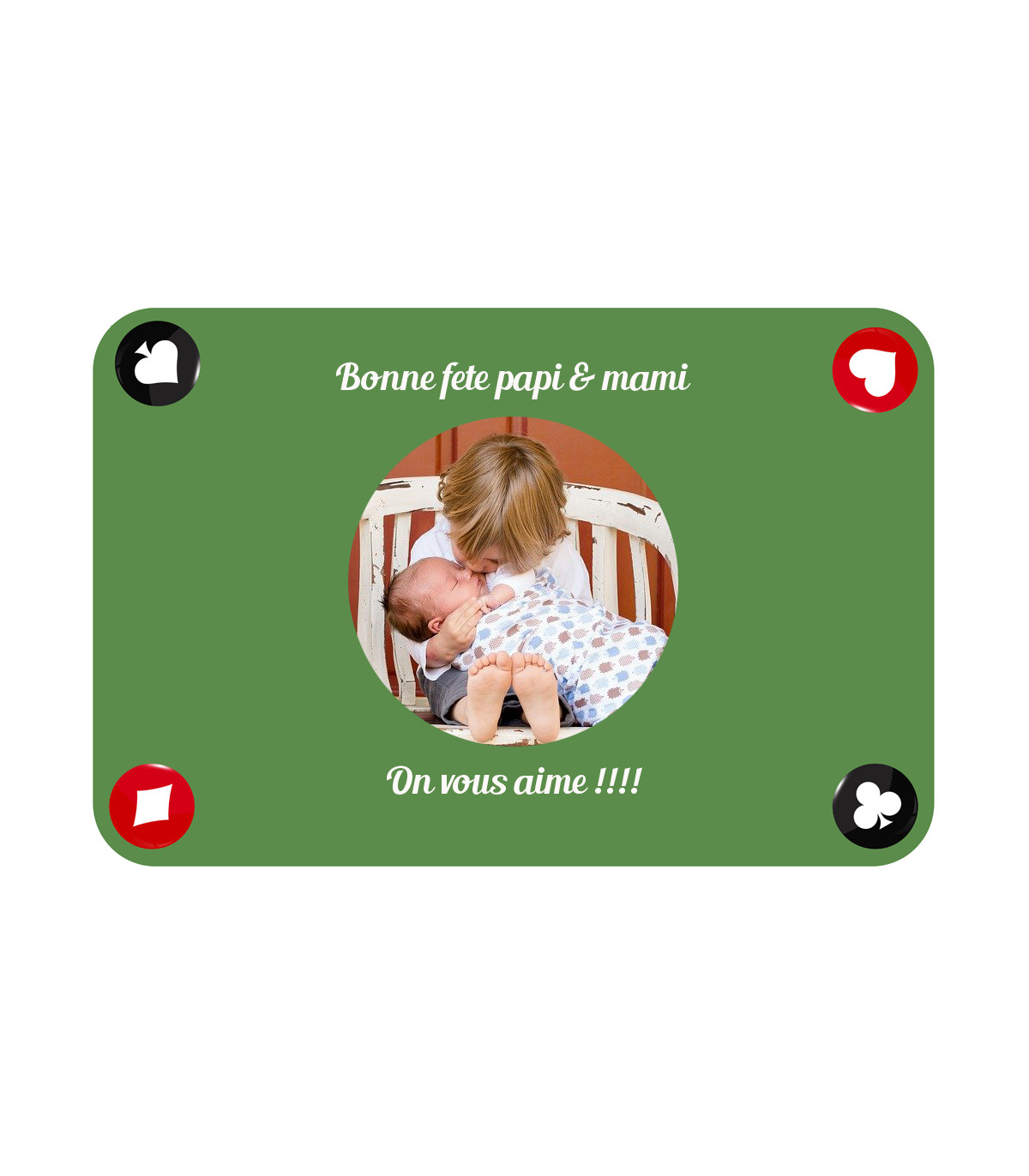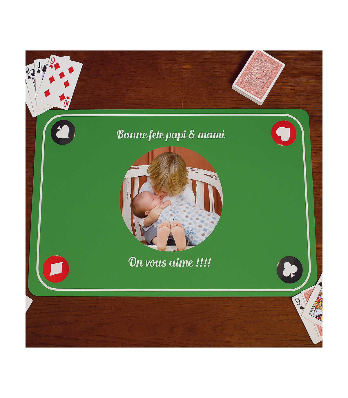 Créez votre tapis de cartes personnalisé (40x60cm, 5mm) pour Belote ou Poker. Antidérapant, il est imprimé en France sous 48h : le cadeau de famille idéal !