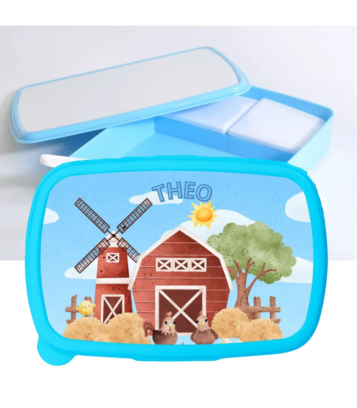 Pour être sûr que cette boîte ne se perde jamais, on ajoute la touche magique de la personnalisation : le prénom de votre enfant est imprimé directement sur le couvercle, juste à côté des animaux de la ferme. C'est l'assurance qu'il n'y aura aucune confusion à la cantine ou à l'heure du pique-nique !