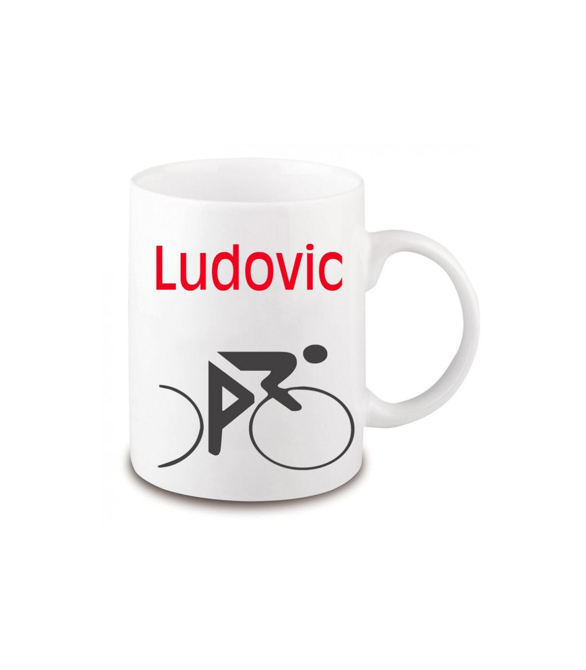 Mug en céramique blanche (9,5 x 8 cms) pour fan de cyclisme. Cadeau pratique, personnalisable avec le prénom de votre choix.