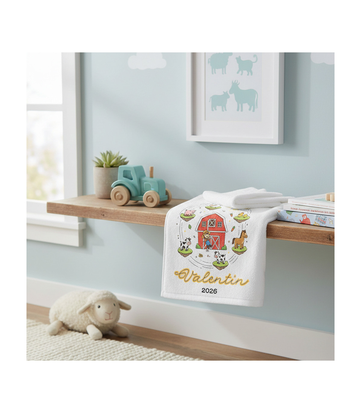 - Prénom de l'enfant : Inscrivez son prénom au milieu du décor de la ferme pour qu'il reconnaisse sa serviette d'un seul coup d'œil, que ce soit à la maison ou à la crèche.